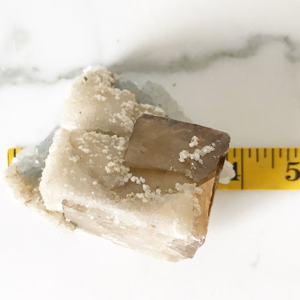 Unique brown hued calcite crystal accented by an ivory coating and set upon a blue chalcedony backdrop.