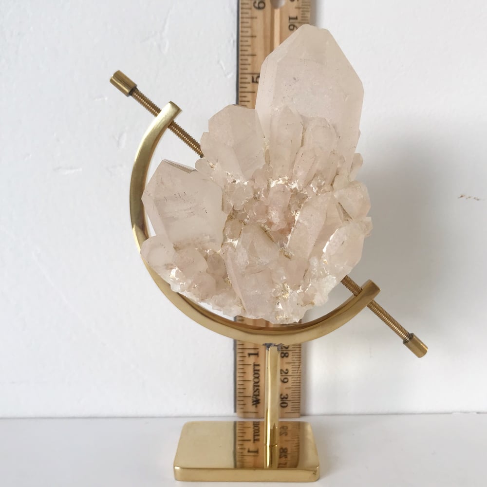 Quartz specimen is highlighted by a brass stand.