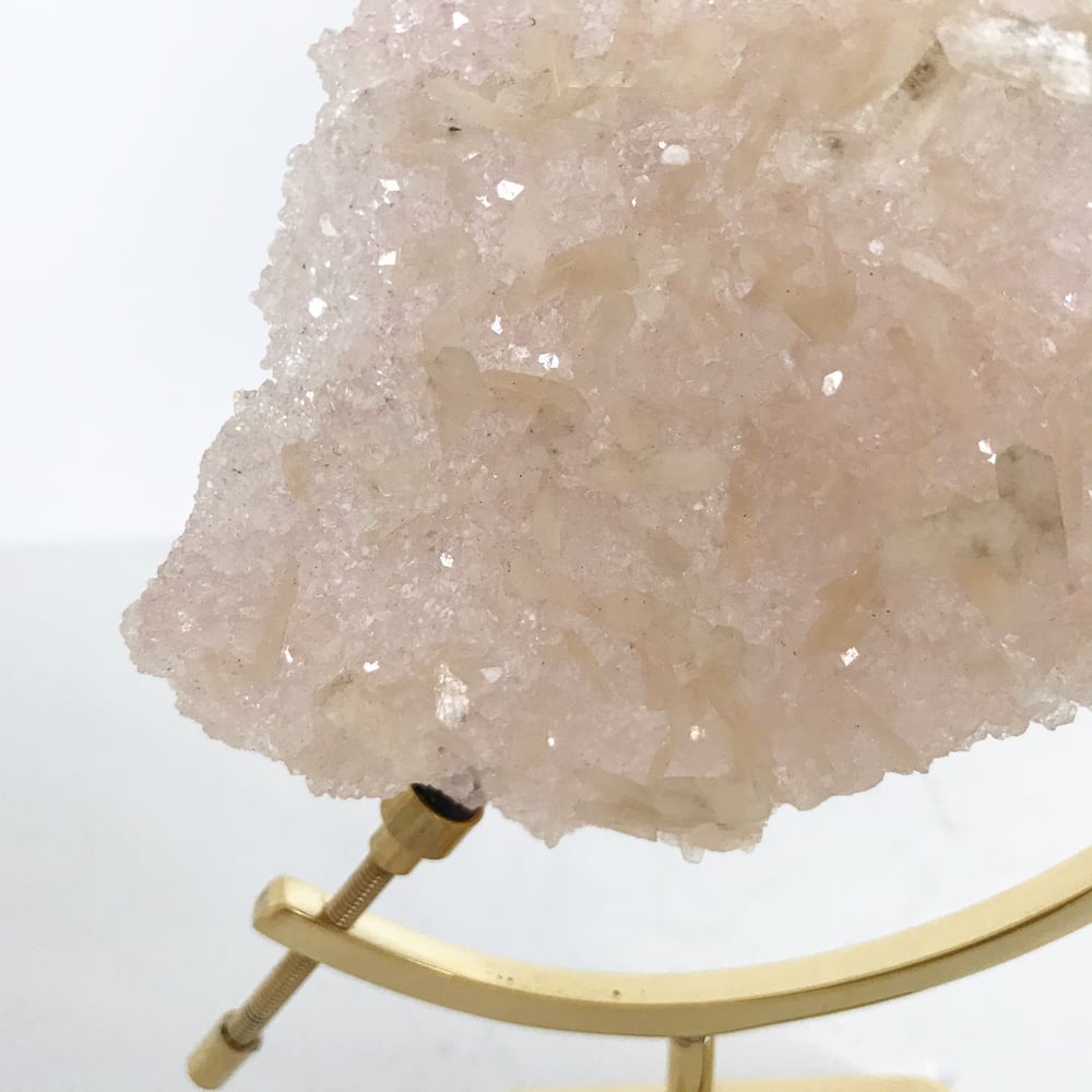 Gorgeous quartz crystal cluster has a delicate pale pink matrix comprised solely of quartz crystals sprinkled with nude stilbite crystals across the face of the crystal matrix layered with additional extra sparkly pointed quartz crystals across the face of the cluster